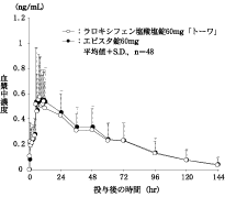 ラロキシフェン塩酸塩錠60mg「トーワ」とエビスタ錠60mgを、クロスオーバー法によりそれぞれ1錠(ラロキシフェン塩酸塩として60mg)閉経後健康女性に絶食単回経口投与して血漿中未変化体濃度を測定し、得られた薬物動態パラメータ(AUC、Cmax)について90%信頼区間法にて統計解析を行った結果、log(0.80)~log(1.25)の範囲内であり、両剤の生物学的同等性が確認された。6)