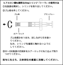 通常、成人1回1シリンジ(精製ヒアルロン酸ナトリウムとして1回25mg)を1週間ごとに連続5回膝関節腔内又は肩関節(肩関節腔、肩峰下滑液包又は上腕二頭筋長頭腱腱鞘)内に投与するが、症状により投与回数を適宜増減する。
