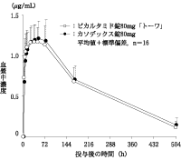 ビカルタミド錠80mg「トーワ」とカソデックス錠80mgを、クロスオーバー法によりそれぞれ1錠(ビカルタミドとして80mg)健康成人男子に絶食単回経口投与して血漿中R-ビカルタミド(活性体)濃度を測定し、得られた薬物動態パラメータ(AUC、Cmax)について90%信頼区間法にて統計解析を行った結果、log(0.80)~log(1.25)の範囲内であり、両剤の生物学的同等性が確認された。4)