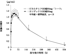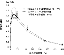 健康成人男子にビカルタミド錠80mg又はビカルタミドOD錠80mg(水なし)をクロスオーバー法にて空腹時に単回経口投与した。R-ビカルタミド(活性体)の血漿中濃度は投与後36時間に最高値を示し、消失半減期は4.9~5.2日であった。また、ビカルタミド錠とOD錠は生物学的に同等であった。1)