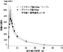 イマチニブ錠100mg「トーワ」とグリベック錠100mgを、クロスオーバー法によりそれぞれ1錠(イマチニブとして100mg)健康成人男子(n=20)に絶食単回経口投与して血漿中濃度を測定し、得られた薬物動態パラメータ(AUC、Cmax)について90%信頼区間法にて統計解析を行った結果、log(0.80)~log(1.25)の範囲内であり、両剤の生物学的同等性が確認された。5)