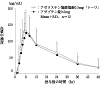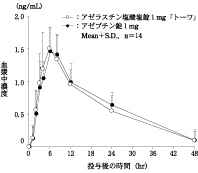 アゼラスチン塩酸塩錠1mg「トーワ」とアゼプチン錠1mgを、クロスオーバー法によりそれぞれ3錠(アゼラスチン塩酸塩として3mg)健康成人男子に絶食単回経口投与して血漿中未変化体濃度を測定し、得られた薬物動態パラメータ(AUC、Cmax)について統計解析を行った結果、両剤の生物学的同等性が確認された。2)