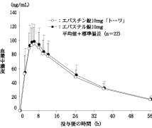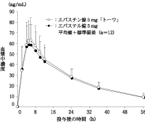 エバスチン錠5mg「トーワ」とエバステル錠5mgを、クロスオーバー法によりそれぞれ1錠(エバスチンとして5mg)健康成人男子に絶食単回経口投与して活性代謝物であるカレバスチンの血漿中濃度を測定し、得られた薬物動態パラメータ(AUC、Cmax)について90%信頼区間法にて統計解析を行った結果、log(0.80)~log(1.25)の範囲内であり、両剤の生物学的同等性が確認された。1)