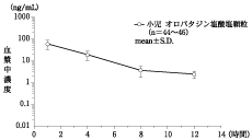 小児アレルギー患者(2~6歳、91例)にオロパタジン塩酸塩顆粒0.5g(オロパタジン塩酸塩として2.5mg)を1日2回14日間反復経口投与した。定常状態で各患児から1~2時点を採血したときの血漿中濃度推移は以下のとおりであった。3)