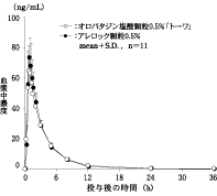 オロパタジン塩酸塩顆粒0.5%「トーワ」とアレロック顆粒0.5%を、クロスオーバー法によりそれぞれ1g(オロパタジン塩酸塩として5mg)健康成人男子に絶食単回経口投与して血漿中未変化体濃度を測定し、得られた薬物動態パラメータ(AUC、Cmax)について90%信頼区間法にて統計解析を行った結果、log(0.80)~log(1.25)の範囲内であり、両剤の生物学的同等性が確認された。5)