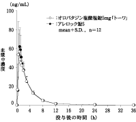 オロパタジン塩酸塩錠5mg「トーワ」とアレロック錠5を、クロスオーバー法によりそれぞれ1錠(オロパタジン塩酸塩として5mg)健康成人男子に絶食単回経口投与して血漿中未変化体濃度を測定し、得られた薬物動態パラメータ(AUC、Cmax)について90%信頼区間法にて統計解析を行った結果、log(0.80)~log(1.25)の範囲内であり、両剤の生物学的同等性が確認された。3)