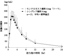 モンテルカスト細粒4mg「トーワ」とシングレア細粒4mgを、クロスオーバー法によりそれぞれ0.5g(モンテルカストとして4mg)健康成人男子に絶食単回経口投与して血漿中未変化体濃度を測定し、得られた薬物動態パラメータ(AUC、Cmax)について90%信頼区間法にて統計解析を行った結果、log(0.80)~log(1.25)の範囲内であり、両剤の生物学的同等性が確認された。10)