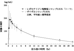 健康成人男性20例にレボセチリジン塩酸塩5mg(シロップ)を空腹時単回経口投与した時、血漿中レボセチリジン濃度は投与後0.75時間には最高血漿中濃度203.3ng/mLに到達した。血漿中濃度の消失半減期は約7.9時間であった。セチリジン塩酸塩10mg(ドライシロップ)を空腹時単回経口投与した時、血漿中レボセチリジン濃度は投与後1時間には最高血漿中濃度196.5ng/mLに到達し、血漿中濃度の消失半減期は約7.9時間であった。レボセチリジン塩酸塩(シロップ)はセチリジン塩酸塩(ドライシロップ)の半量で同様の血漿中レボセチリジン濃度が得られ、血漿中レボセチリジンのCmax及びAUC0-48は同等であった。1)