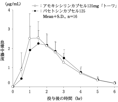 アモキシシリンカプセル125mg「トーワ」とパセトシンカプセル125を、クロスオーバー法によりそれぞれ1カプセル(アモキシシリンとして125mg)健康成人男子に絶食単回経口投与して血漿中未変化体濃度を測定し、得られた薬物動態パラメータ(AUC、Cmax)について90%信頼区間法にて統計解析を行った結果、log(0.80)~log(1.25)の範囲内であり、両剤の生物学的同等性が確認された。6)
