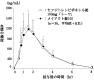 セフジトレンピボキシル錠100mg「トーワ」とメイアクト錠100 を、クロスオーバー法によりそれぞれ1錠(セフジトレン ピボキシルとして100mg(力価))健康成人男子に絶食単回経口投与して活性代謝物であるセフジトレンの血漿中濃度を測定し、得られた薬物動態パラメータ(AUC、Cmax)について90%信頼区間法にて統計解析を行った結果、log(0.80)~log(1.25)の範囲内であり、両剤の生物学的同等性が確認された。2)