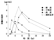 腎機能障害患者及び人工透析導入患者(いずれも成人)に200mgを食後単回経口投与した場合、セフジトレンの血清中濃度・薬物動態パラメータは、図・表のとおりであり、いずれの場合も高値で推移し、腎機能の障害の程度に応じたT1/2の遅延が認められた。また、尿中排泄率は腎機能の障害の程度が大きくなるにつれて低下し、排泄の遅延が認められた。3),