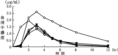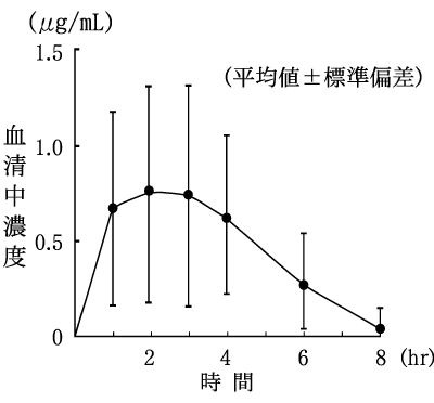 1~7歳の小児患者5例に3mg(力価)/kgを食後単回経口投与したときのセフカペンの血清中濃度を図16-1、薬物動態パラメータを表16-1に示す。2)
