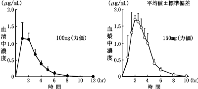 健康成人各6例に100mg(力価)、150mg(力価)を食後単回経口投与したときのセフカペンの血清中、血漿中濃度を図16-1、薬物動態パラメータを表16-1に示す。なお、100mg(力価)投与例と150mg(力価)投与例は被験者群が異なる。Cmax、AUCはいずれも用量に比例して増加した。2),3),4),5)
