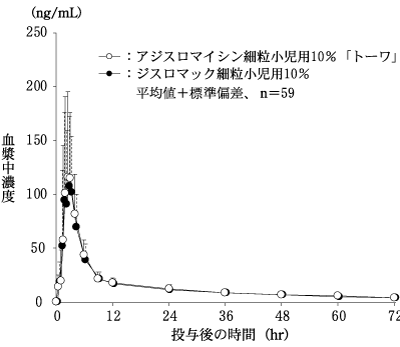 *アジスロマイシン細粒小児用10%「トーワ」とジスロマック細粒小児用10%を、クロスオーバー法によりそれぞれ2g(アジスロマイシンとして200mg(力価))健康成人男子に絶食単回経口投与して血漿中アジスロマイシン濃度を測定し、得られた薬物動態パラメータ(AUC、Cmax)について90%信頼区間法にて統計解析を行った結果、log(0.80)~log(1.25)の範囲内であり、両剤の生物学的同等性が確認された。21)