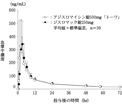 アジスロマイシン錠の1200mg投与で、アジスロマイシンの濃度・時間曲線下面積(AUC)及び平均最高血中濃度の上昇の報告がある9)。