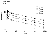 健康成人23例にミカファンギンナトリウム25mg注)、50mg及び75mgを30分あるいは150mgを1時間かけて静脈内持続投与したとき、血漿中未変化体のAUCは投与量に比例して増加した。血漿中濃度は投与終了時に最高となり、消失半減期は13.9時間であった。11)