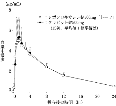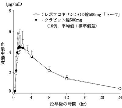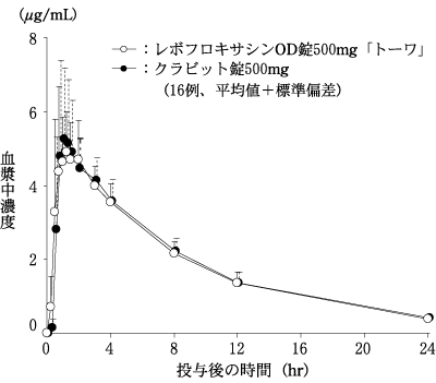 レボフロキサシンOD錠500mg「トーワ」(販売中止)とクラビット錠500mgを、クロスオーバー法によりそれぞれ1錠(レボフロキサシンとして500mg)健康成人男子に絶食単回経口投与(水なしで服用及び水で服用)して血漿中未変化体濃度を測定し、得られた薬物動態パラメータ(AUC、Cmax)について90%信頼区間法にて統計解析を行った結果、log(0.80)~log(1.25)の範囲内であり、両剤の生物学的同等性が確認された。6)
