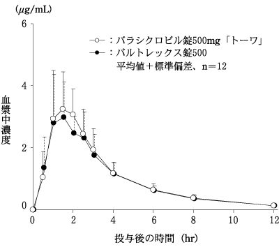 バラシクロビル錠500mg「トーワ」とバルトレックス錠500を、クロスオーバー法によりそれぞれ1錠(バラシクロビルとして500mg)健康成人男子に絶食単回経口投与して活性代謝物であるアシクロビルの血漿中濃度を測定し、得られた薬物動態パラメータ(AUC、Cmax)について90%信頼区間法にて統計解析を行った結果、log(0.80)~log(1.25)の範囲内であり、両剤の生物学的同等性が確認された。6)