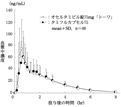 健康成人男子28例にオセルタミビルとして37.5、75、150及び300mgを単回経口投与注1)(絶食時)したときのオセルタミビル活性体の薬物動態パラメータは以下のとおりであり、AUCinf及びCmaxは用量比例的に増加することが示された。1)