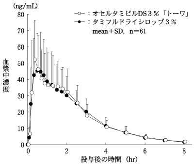オセルタミビルDS3%「トーワ」とタミフルドライシロップ3%を、クロスオーバー法によりそれぞれ2.5g(オセルタミビルとして75mg)健康成人男子に絶食単回経口投与して血漿中未変化体濃度を測定し、得られた薬物動態パラメータ(AUC、Cmax)について90%信頼区間法にて統計解析を行った結果、いずれもlog(0.80)~log(1.25)の範囲内であり、両剤の生物学的同等性が確認された。2)