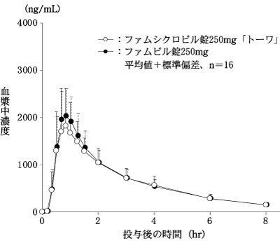 ファムシクロビル錠250mg「トーワ」とファムビル錠250mgを、クロスオーバー法によりそれぞれ1錠(ファムシクロビルとして250mg)健康成人男子に絶食単回経口投与して活性代謝物であるペンシクロビルの血漿中濃度を測定し、得られた薬物動態パラメータ(AUC、Cmax)について90%信頼区間法にて統計解析を行った結果、log(0.80)~log(1.25)の範囲内であり、両剤の生物学的同等性が確認された。12)
