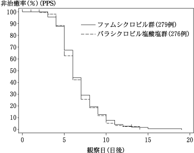 国内で実施されたアシクロビル対照二重盲検比較試験(計50施設、471例)において、病変部位が完全痂皮化するまでの日数で、ファムシクロビル(1回500mg 1日3回投与)のアシクロビル(1回800mg 1日5回投与)に対する非劣性が検証された(ハザード比1.080、信頼区間0.888~1.312)。また、ファムシクロビルとアシクロビルの完全痂皮化率の推移は概して相似しており、完全痂皮化までの日数の50%点はいずれも7日であった。30)