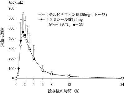 *テルビナフィン錠125mg「トーワ」とラミシール錠125mgを、クロスオーバー法によりそれぞれ1錠(テルビナフィンとして125mg)健康成人男子に絶食単回経口投与して血漿中未変化体濃度を測定し、得られた薬物動態パラメータ(AUC、Cmax)について統計解析を行った結果、log(0.80)~log(1.25)の範囲内であり、両剤の生物学的同等性が確認された。3)