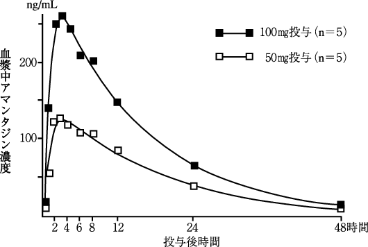 健康成人にアマンタジン塩酸塩50mg及び100mgを1回経口投与した場合、投与後約24時間で投与量の約60%が、48時間までに約70%が未変化体で尿中に排泄される8)。,,,