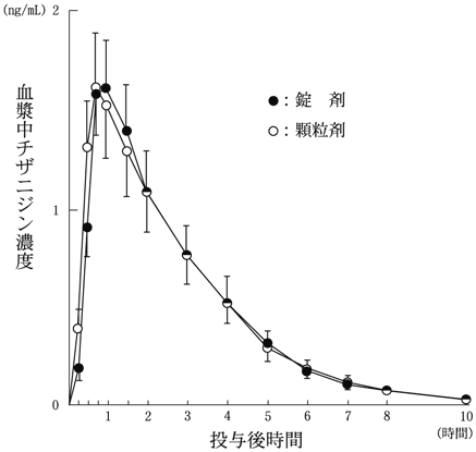 健康成人にテルネリン錠1mgを2錠又は顆粒0.2%を1g(チザニジンとして2mg)それぞれ1回経口投与した場合の血漿中濃度の推移は次のとおりである。また、薬物動態パラメータから両剤の生物学的同等性が確認された。