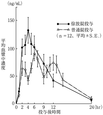 健康成人を二群に分け、徐放錠(120mg)を朝食後1日1回、普通錠(40mg)を毎食後1日3回cross over投与した場合の平均血漿中濃度推移と各々の血漿中濃度より算出した薬物動態パラメーターは以下のとおりであり、両者のバイオアベイラビリティは同等であった1)。