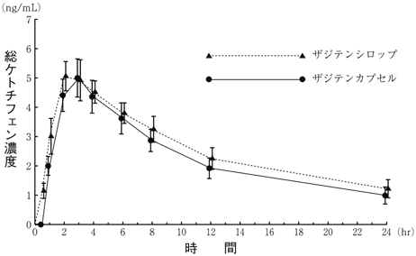 健康成人に本剤10mL(ケトチフェンとして2mg)を1回経口投与した場合の薬物動態は、下表及び図のごとくであり、ザジテンカプセルとほぼ同じと推定された。また、本剤を小児患者に投与した場合、健康成人に比べやや吸収が遅く、血中からの消失が速いことが示された。