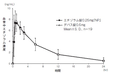エチゾラム錠0.25mg「NP」2錠とデパス錠0.5mg 1錠(エチゾラムとして0.5mg)を、クロスオーバー法により健康成人男子に絶食単回経口投与して血漿中エチゾラム濃度を測定した。得られた薬物動態パラメータ(AUC0→24hr、Cmax)について90%信頼区間法にて統計解析を行った結果、log(0.80)~log(1.25)の範囲内であり、両剤の生物学的同等性が確認された2)。