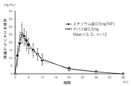 エチゾラム錠0.5mg「NP」とデパス錠0.5mgのそれぞれ4錠(エチゾラムとして2mg)を、クロスオーバー法により健康成人男子に絶食単回経口投与して血漿中エチゾラム濃度を測定した。得られた薬物動態パラメータ(AUC0→48hr、Cmax)について統計解析を行った結果、両剤の生物学的同等性が確認された3)。