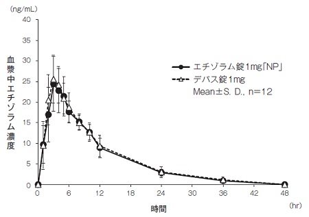 エチゾラム錠1mg「NP」とデパス錠1mgのそれぞれ2錠(エチゾラムとして2mg)を、クロスオーバー法により健康成人男子に絶食単回経口投与して血漿中エチゾラム濃度を測定した。得られた薬物動態パラメータ(AUC0→48hr、Cmax)について統計解析を行った結果、両剤の生物学的同等性が確認された4)。