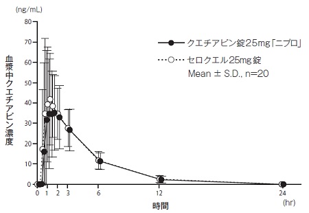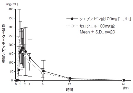 クエチアピン錠100mg「ニプロ」とセロクエル100mg錠のそれぞれ1錠(クエチアピンとして100mg)を、クロスオーバー法により健康成人男子に絶食単回経口投与して血漿中クエチアピン濃度を測定した。得られた薬物動態パラメータ(AUC0→24hr、Cmax)について90%信頼区間法にて統計解析を行った結果、log(0.80)~log(1.25)の範囲内であり、両剤の生物学的同等性が確認された5)。