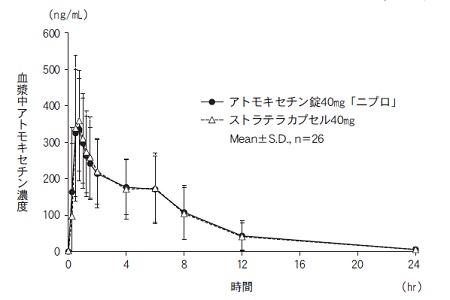 CYP2D6 EM健康成人にアトモキセチン10、40、90又は120mgを単回経口投与注18)したときの最高血漿中濃度(Cmax)及び血漿中濃度曲線下面積(AUC)は、投与量に比例して増加した2)。