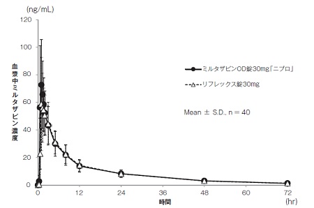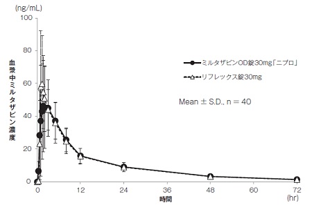ミルタザピンOD錠15mg「ニプロ」は、ミルタザピンOD錠30mg「ニプロ」を標準製剤としたとき、溶出挙動が同等と判断され、生物学的に同等とみなされた22)。