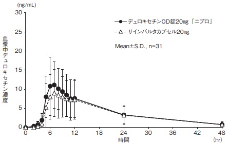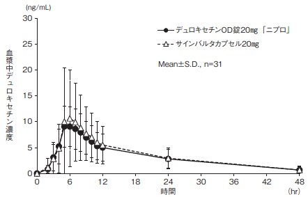 7) 社内資料:生物学的同等性試験(OD錠20mg、食後・水あり投与)