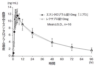 健康成人(CYP2C19のPM(Poor Metabolizer)及びEM(Extensive Metabolizer)各6例)に絶食下でエスシタロプラム5mg、10mg、20mgを単回経口投与した。CYP2C19EM群では投与後3.8~4.3時間で最高血漿中濃度(Cmax)に達し、消失半減期(t1/2)は24.6~27.7時間であり、Cmax及び血中濃度-時間曲線下面積(AUC)は投与量にほぼ比例して増加した。CYP2C19PM群における最高血漿中濃度到達時間及びCmaxはCYP2C19EM群と同程度であったが、AUC及びt1/2はCYP2C19EM群の約2倍であった4)。,,