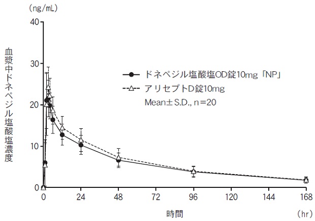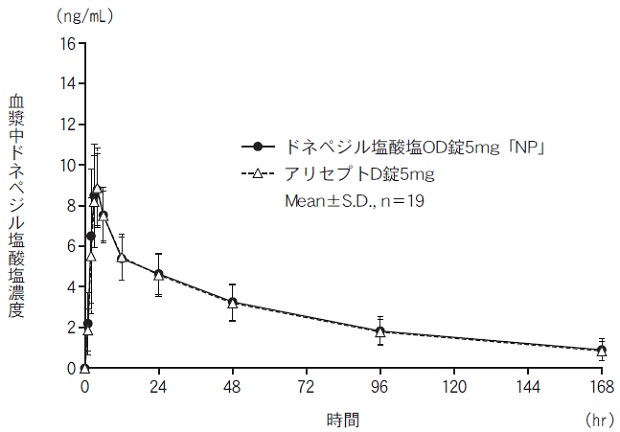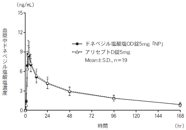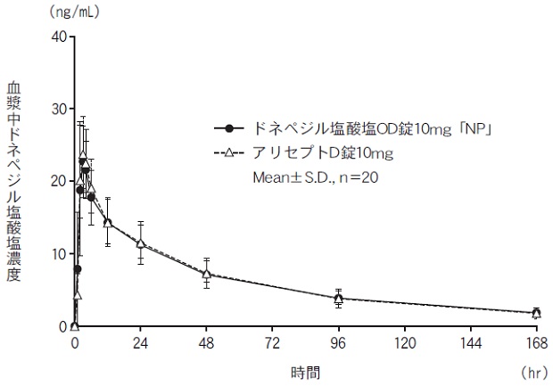 ドネペジル塩酸塩OD錠5mg「NP」とアリセプトD錠5mgのそれぞれ1錠(ドネペジル塩酸塩として5mg)を、クロスオーバー法により健康成人男子に絶食単回経口投与して血漿中ドネペジル塩酸塩濃度を測定した。 得られた薬物動態パラメータ(AUC0→168hr、Cmax)について90%信頼区間法にて統計解析を行った結果、log(0.80)~log(1.25)の範囲内であり、両剤の生物学的同等性が確認された3),4)。