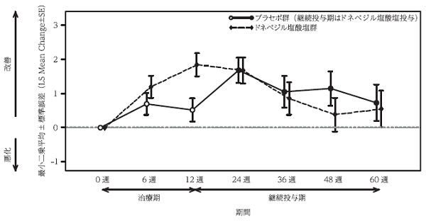 本試験では、認知機能障害、精神症状・行動障害の両症状に対するドネペジル塩酸塩の有効性がプラセボに比較して優れているという検証仮説は検証されていない22)。
