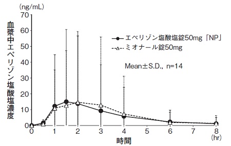 エペリゾン塩酸塩錠50mg「NP」とミオナール錠50mgのそれぞれ3錠(エペリゾン塩酸塩として150mg)を、クロスオーバー法により健康成人男子に絶食時に単回経口投与して血漿中未変化体濃度を測定した。得られた薬物動態パラメータ(AUC0→8hr、Cmax)の平均値の差の95%信頼区間にて統計解析を行った結果、両剤は生物学的に同等と判断された1)。