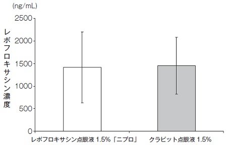 レボフロキサシン点眼液1.5%「ニプロ」とクラビット点眼液1.5%をウサギ結膜嚢内にそれぞれ30μL単回点眼投与し、30分後の眼房水中濃度を測定したところ、濃度比に有意差は認められなかった。また、2群の平均値の差の90%信頼区間はlog(0.80)~log(1.25)の範囲内であった。したがって、両製剤の生物学的同等性が確認された3)。