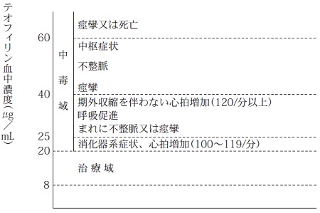 テオフィリン血中濃度が高値になると、血中濃度の上昇に伴い、消化器症状(特に悪心、嘔吐)や精神神経症状(頭痛、不眠、不安、興奮、痙攣、せん妄、意識障害、昏睡等)、心・血管症状(頻脈、心室頻拍、心房細動、血圧低下等)、低カリウム血症その他の電解質異常、呼吸促進、横紋筋融解症等の中毒症状が発現しやすくなる。なお、軽微な症状から順次発現することなしに重篤な症状が発現することがある。,