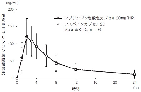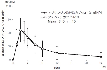 アプリンジン塩酸塩カプセル10mg「NP」とアスペノンカプセル10のそれぞれ4カプセル(アプリンジン塩酸塩として40mg)を、クロスオーバー法により健康成人男子に絶食時に単回経口投与して血漿中未変化体濃度を測定した。得られた薬物動態パラメータ(AUC0→24hr、Cmax)の平均値の差の95%信頼区間は±20%の範囲にあり、両剤の生物学的同等性が確認された16)。