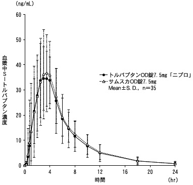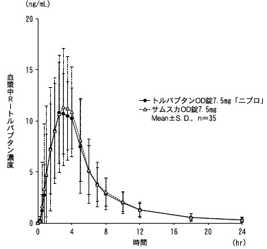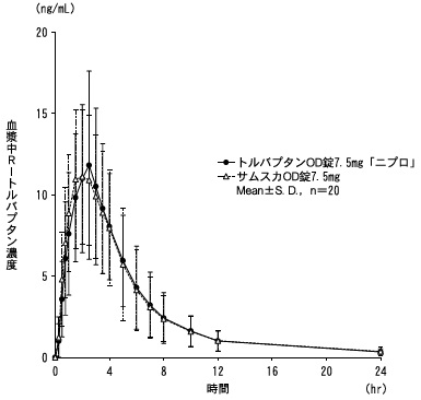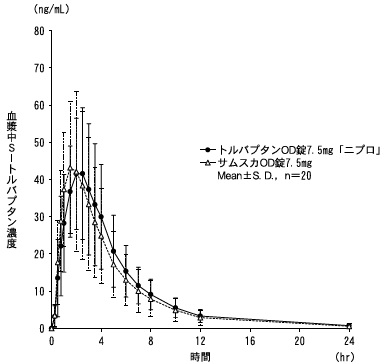 健康成人にトルバプタン15mgを単回経口投与した時、空腹時投与に比べ食後投与ではCmax及びAUCはそれぞれ1.3倍及び1.1倍であった4)。
