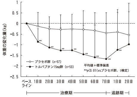 他の利尿薬を投与しても体液貯留が認められるうっ血性心不全患者を対象とした二重盲検比較試験において、トルバプタン15mg又はプラセボを1日1回7日間経口投与した。主要評価項目である最終投与時の体重変化量は、トルバプタン15mg群-1.54±1.61kg(ベースライン:59.42±12.30kg、53例)(平均値±標準偏差、以下同様)、プラセボ群-0.45±0.93kg(ベースライン:55.68±12.60kg、57例)であり、トルバプタン群では、プラセボ群に比較して有意な体重減少が認められた(p<0.0001、t検定)。体重減少は投与翌日よりみられ投与期間を通じて継続した(図17-1)。また、最終投与時における心性浮腫に伴う所見(頚静脈怒張、肝腫大、下肢浮腫)が改善した(表17-1)。