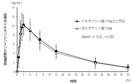 ドキサゾシン錠1mg「ニプロ」とカルデナリン錠1mgのそれぞれ1錠(ドキサゾシンとして1mg)を、クロスオーバー法により健康成人男子に絶食単回経口投与して血漿中ドキサゾシンメシル酸塩濃度を測定した。得られた薬物動態パラメータ(AUC0→34hr、Cmax)について90%信頼区間法にて統計解析を行った結果、log(0.80)~log(1.25)の範囲内であり、両剤の生物学的同等性が確認された7) 。