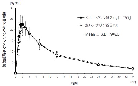 ドキサゾシン錠2mg「ニプロ」とカルデナリン錠2mgのそれぞれ1錠(ドキサゾシンとして2mg)を、クロスオーバー法により健康成人男子に絶食単回経口投与して血漿中ドキサゾシンメシル酸塩濃度を測定した。得られた薬物動態パラメータ(AUC0→34hr、Cmax)について90%信頼区間法にて統計解析を行った結果、log(0.80)~log(1.25)の範囲内であり、両剤の生物学的同等性が確認された8) 。