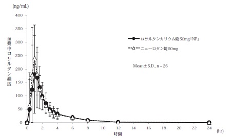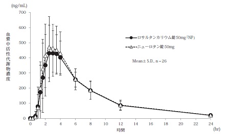 ロサルタンカリウム錠50mg「NP」とニューロタン錠50mgのそれぞれ1錠(ロサルタンカリウムとして50mg)を、クロスオーバー法により健康成人男子に絶食単回経口投与して血漿中ロサルタン濃度及び活性代謝物濃度を測定した。得られたそれぞれの薬物動態パラメータ(AUC0→24hr、Cmax)について統計解析を行った結果、両剤の生物学的同等性が確認された7)。